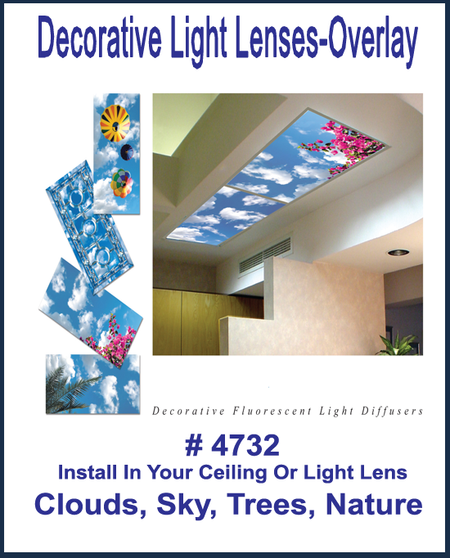 Decorative light lens covers for fluorescent lights. Transform your workspace with these custom-designed covers that enhance lighting and provide a professional look. Made with high-quality, durable materials, these covers are easy to install and will instantly upgrade any room. Decorative lenses measure 23-¾" x 47-¾" and are .05 mils in thickness. Our lenses drop into a standard 2’x4’ ceiling grid system. If your light fixture is smaller, to fit in a 2'x4' lighting fixture frame, our decorative light lenses can easily be cut with a good pair of scissors or a utility knife to fit your existing light frame. Follow the image "INSTALLING", attached to size down your lens. Our panels are rolled to reduce shipping costs. The decorative lens has a bit of memory, so when you receive your lenses promptly remove them from the box and lay flat until installation. If you store them in the box too long and they are curled, lay them flat to rest. Your panels will flatten out, and if you don’t have time to wait,  "Add a 10-pack of spring clips, #4732-Spring Clip-10pack" to your order. Our spring clips will hold them flat in the light fixture’s frame. Regular cleaning with a damp cloth will keep your new panels clean and bright.