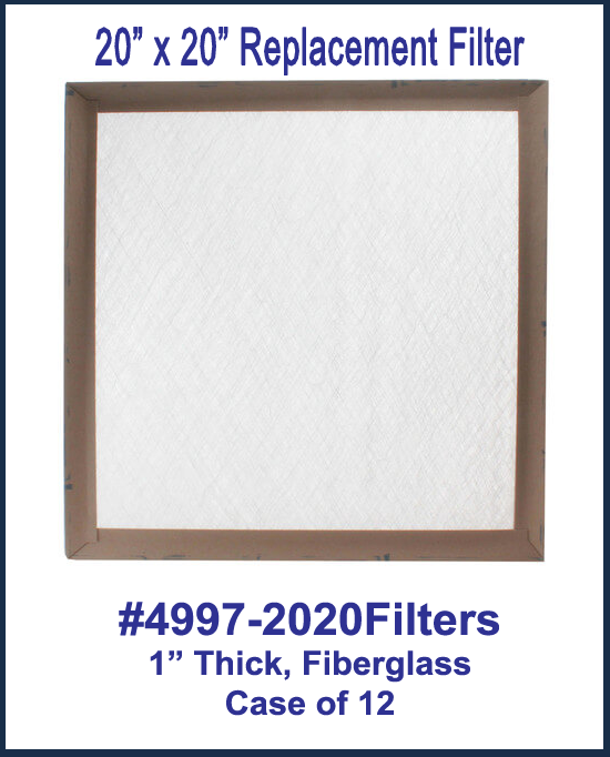 20" x 20" x 1" Fiberglass Throw Away Replacement Filter-Case of 12. Fits in our item #'s: 4989W & 4989BK (24"x24" Plastic Filtered Air Returns).