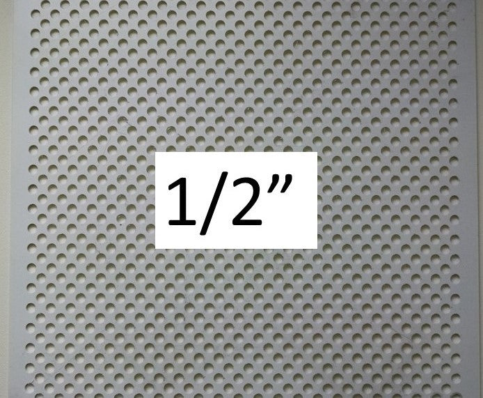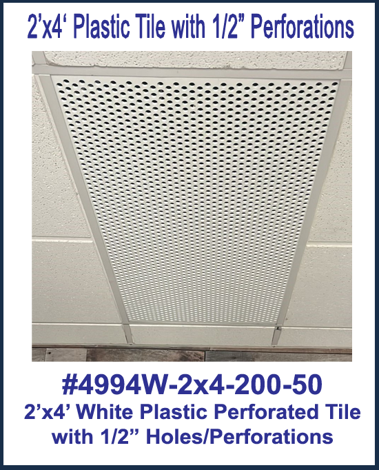 This non-corrosive 2'x4' White Plastic Perforated tile, 1/2" Perforations is the perfect ceiling air return for 2’x4’ ceiling grid systems. In addition to being a functional component, the plastic air return also serves as a more aesthetically appealing ceiling air vent than an old, rusted metal returns or egg crate-style return. The HVAC diffuser lets return air and heat escape to the plenum. The item is made of durable ABS plastic and is available in white. White Plastic Perforated Tile/Return. Measures 23-3/4" x 47-3/4". Designed to fit in a 2'x4' ceiling grid system. The plastic sheet is .200 thick. Made from ABS plastic. See attached spec sheets. 1/2" perforated tiles have a 45% open area. Tile is .200" thick, (5mm)