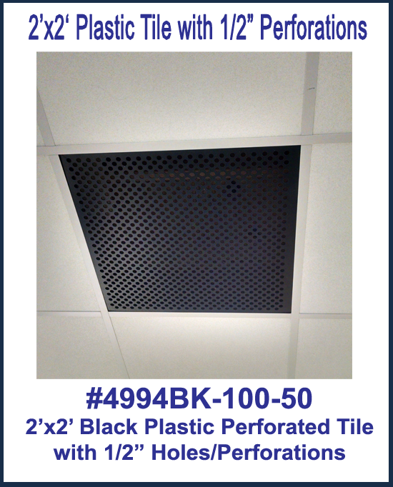 This non-corrosive 2'x2' Black Plastic Perforated Tile, with 1/2" Perforations is the perfect ceiling air return for 2'x2' ceiling grid systems to let hot air escape. In addition to being a functional component, the plastic perforated tile also serves a more aesthetically appealing ceiling air vent. These perfroated tiles also are extremely durable and replace old style, fragile egg crate. The tile is made of durable ABS plastic and is also available in white plastic and 2'x4' sizes. Measures 23.75" x 23.75" x .100" thick. Designed to fit in a 2'x2' ceiling grid system.