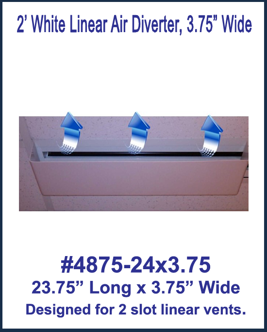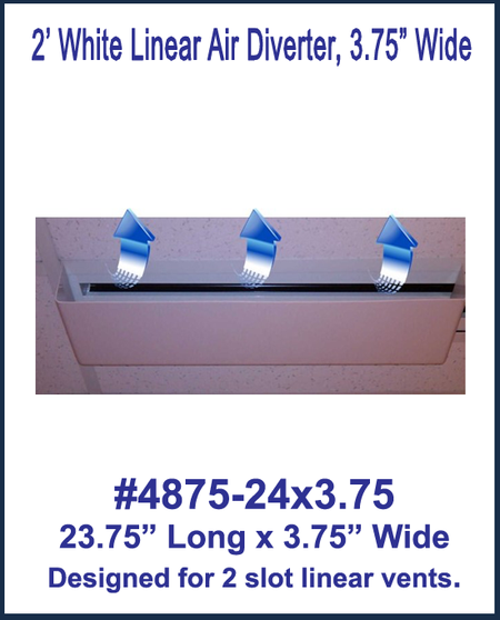 2' White Linear Air Diverter for a 2 Slot Vent installs easily over any 2' long linear 2 slot air vent. The 2' White Linear Air Diverter for a 2 Slot Ven features a perimeter flange that enables it to be installed without tools just by sandwiching the 1/2" flange between the vent and the ceiling grid system. Once installed, the slot air deflector redirects hot or cold air as it leaves the vent rather than being forced down in one spot. The result is a much more comfortable office space. Actual size: 23-3/4" long x 3-3/4" wide.