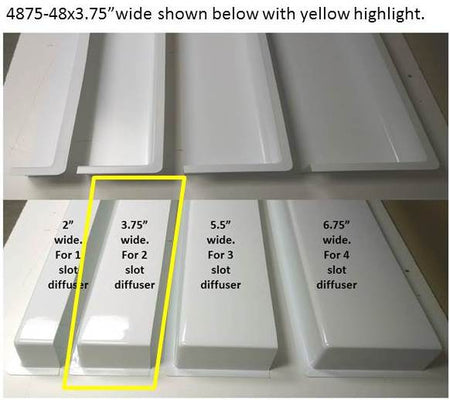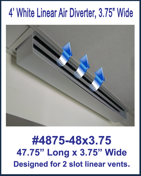 4' White Linear Air Diverter for a 2 Slot Vent installs easily over any 4' long linear 2 slot air vent. The 4' White Linear Air Diverter for a 2 Slot Ven features a perimeter flange that enables it to be installed without tools just by sandwiching the 1/2" flange between the vent and the ceiling grid system. Once installed, the slot air deflector redirects hot or cold air as it leaves the vent rather than being forced down in one spot. The result is a much more comfortable office space. Actual size: 47-3/4" long x 3-3/4" wide.