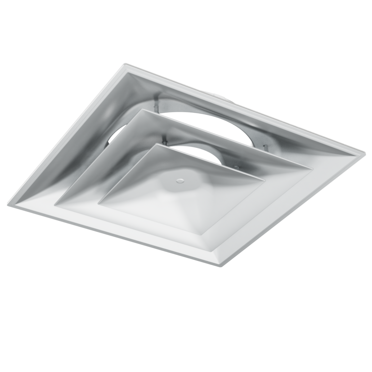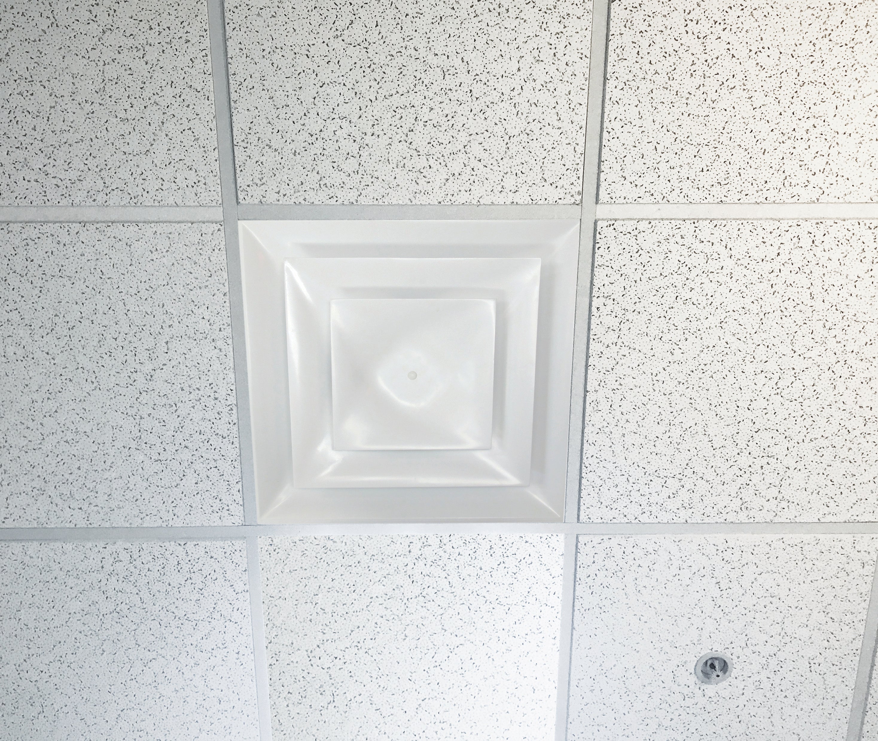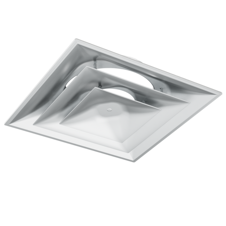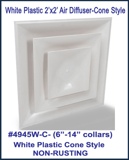 Stratus White Plastic 2'x2' CONE Air Diffusers by American Louver is made with collars from 6" to 14" (backplate included). Ideal for restaurants, hospitals, MRI rooms, dishwashing rooms, office buildings and clean environments. Fits in a 2'x2' ceiling grid system. *Durable ABS material. *Will not rust. *Will not chip or bend (colorant molded into part). *Resists sweating (reducing dust buildup). *Easy to clean. *No Sharp Edges *2" tall neck (for easier connections) *6", 8", 10", 12", 14" collar sizes *Available Black Plastic also *OD= 23-3/4" x 23-3/4". Collar/Neck depth = 2.46", plenty of space to attach the air duct.