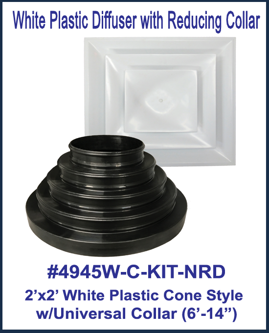 Kit includes one White Plastic 2'x2' Cone Air Diffuser with a 14" neck, one Universal Reducer, one 48" Cable Tie.Kit:14 White Plastic Cone, Universal Collar, 48" ZipTie