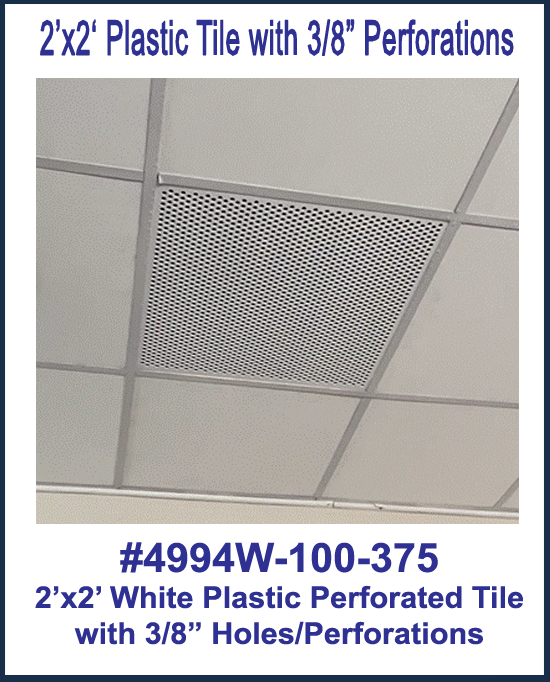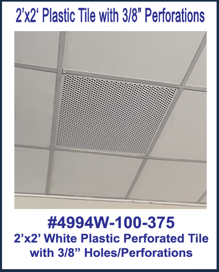 This non-corrosive 2'x2' White Plastic Perforated tile, 3/8" Perforations is the perfect ceiling air return for 2’x2’ ceiling grid systems. In addition to being a functional component, the plastic air return also serves as a more aesthetically appealing ceiling air vent than an old, rusted metal returns or egg crate style return. The HVAC diffuser lets return air and heat escape to the plenum. The item is made of durable ABS plastic and available in white. White Plastic Perforated Tile/Return. Measures 23-3/4" x 23-3/4". Designed to fit in a 2'x2' ceiling grid system. The plastic sheet is .100 thick with 3/8" perforations. Made from ABS plastic. See attached spec sheets. 2'x2' White Plastic Perforated tile, 3/8" Perforations