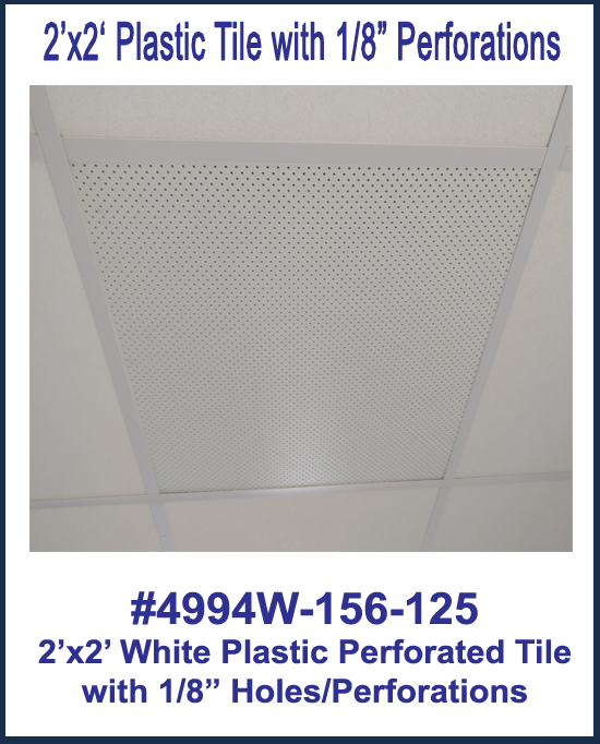 2'x2' White Plastic Perforated tile, 1/8" Perforations Measures 23-3/4" x 23-3/4". Designed to fit in a 2'x2' ceiling grid system. The plastic sheet is .100 thick (5/32"). Durable enough to be taken down and scrubbed in a sink. The perforations are .125 wide (1/8").
